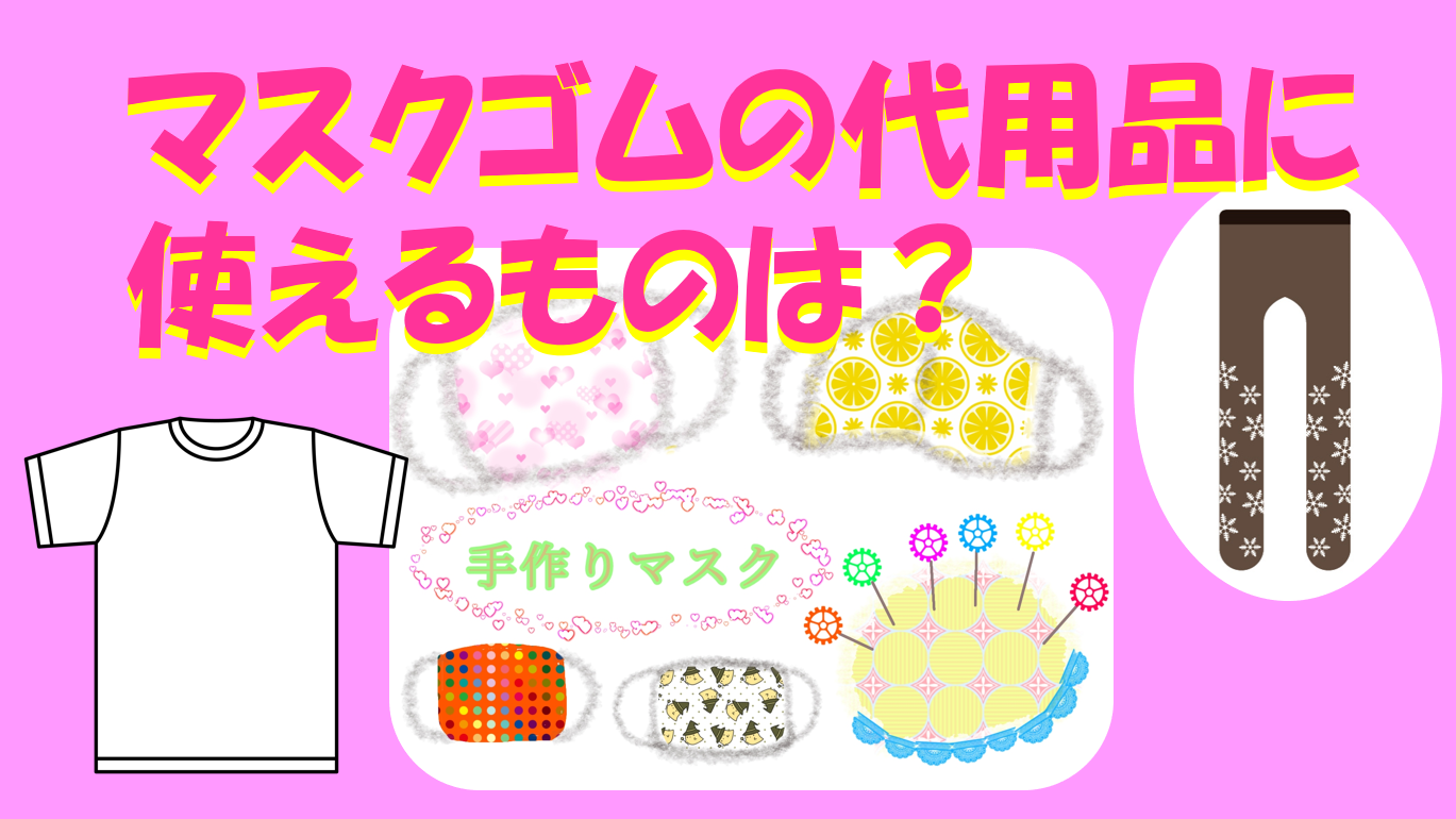 - 市販されているもので、手作りマスクのゴムの代用品に使えるものは、Tシャツヤーン(ズパゲッティ、ニッティングヤーンとも呼ばれる)や、アクリルひも、ナイロントリコットやオリコットの生地があります。