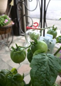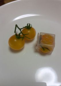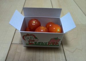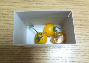 一回目の収穫は、普通の丸いトマトがふたつ、ケースで作った四角いトマトがひとつです。