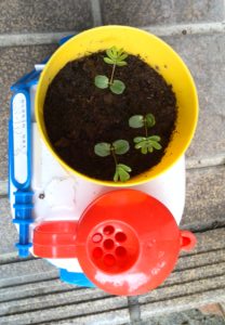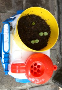 写真が暗くてわかりにくいのですが、手前には自宅の植木鉢にも種蒔きしたので、並んで置いています。本葉が何枚も生えてきたところです。