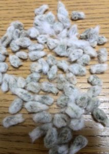 上の写真がわたの種です。わたをほぐすと中から出てきます。秋に種をとるのは娘の楽しい遊びです。