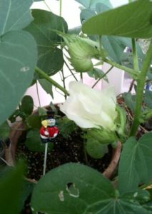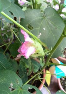 夕方になると閉じます。閉じた姿もちょうちょのようですてきです。わたの花はアサガオと同じように一日しか咲きません。貴重ですね。