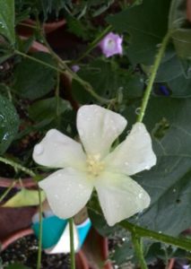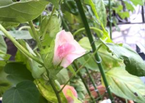 7月、朝、葉の下でかくれるように静かに咲きました。「わたが咲いたよ~!」と言うと、娘もパパも走ってでてきて「おお~っ」と感動します。あまりにもきれいなので、しばらく誰もしゃべりません。