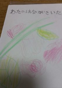 幼稚園のときから綿の花の絵を描いてじっくり観察しています。写真は幼稚園年長のときのお絵かきです。