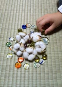 幼稚園でも園庭でできたわたを園児が収穫して、収穫後はおままごとに使ってもんだりひっぱったりいろいろ触って喜んでいるそうです。わたをほぐしてたねを取り出すのは、幼稚園の子供たちはすごく興味もってやっていたそうです。