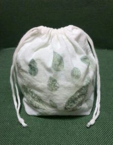 娘は、わたを収穫してほぐすのがとても楽しいようです。我が家で育てている藍染めの材料のタデアイでたたき染めをした巾着袋に収穫した綿をためています。
